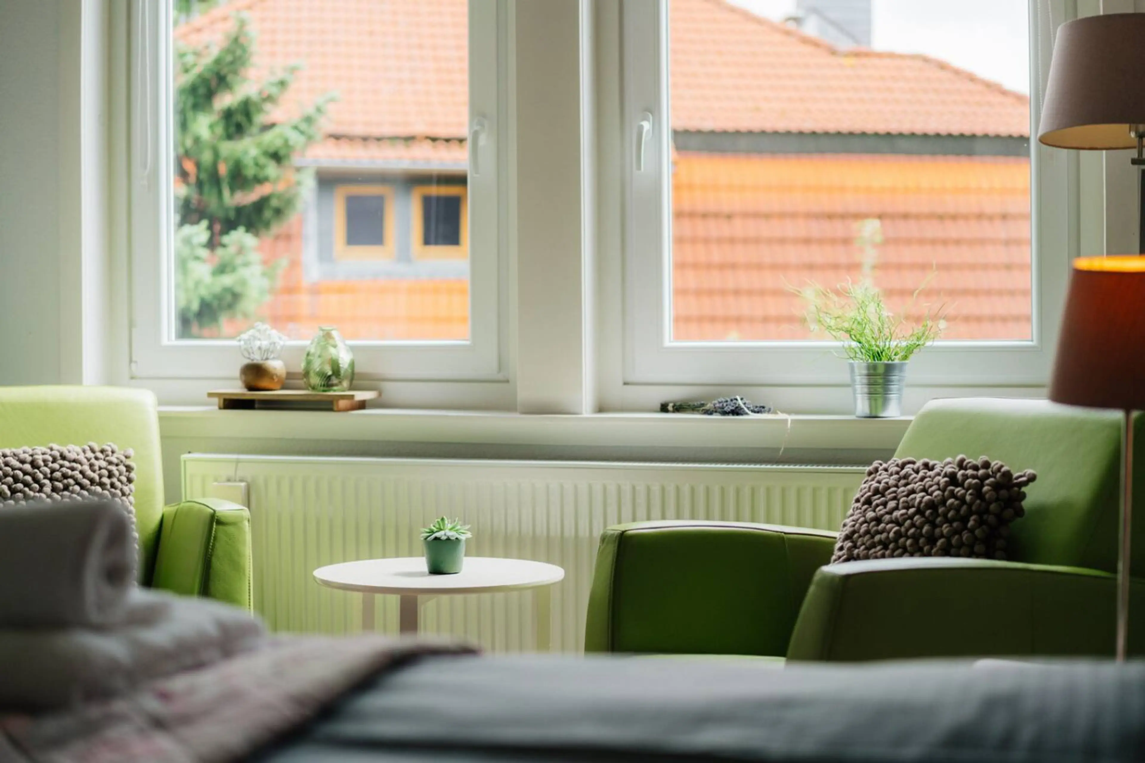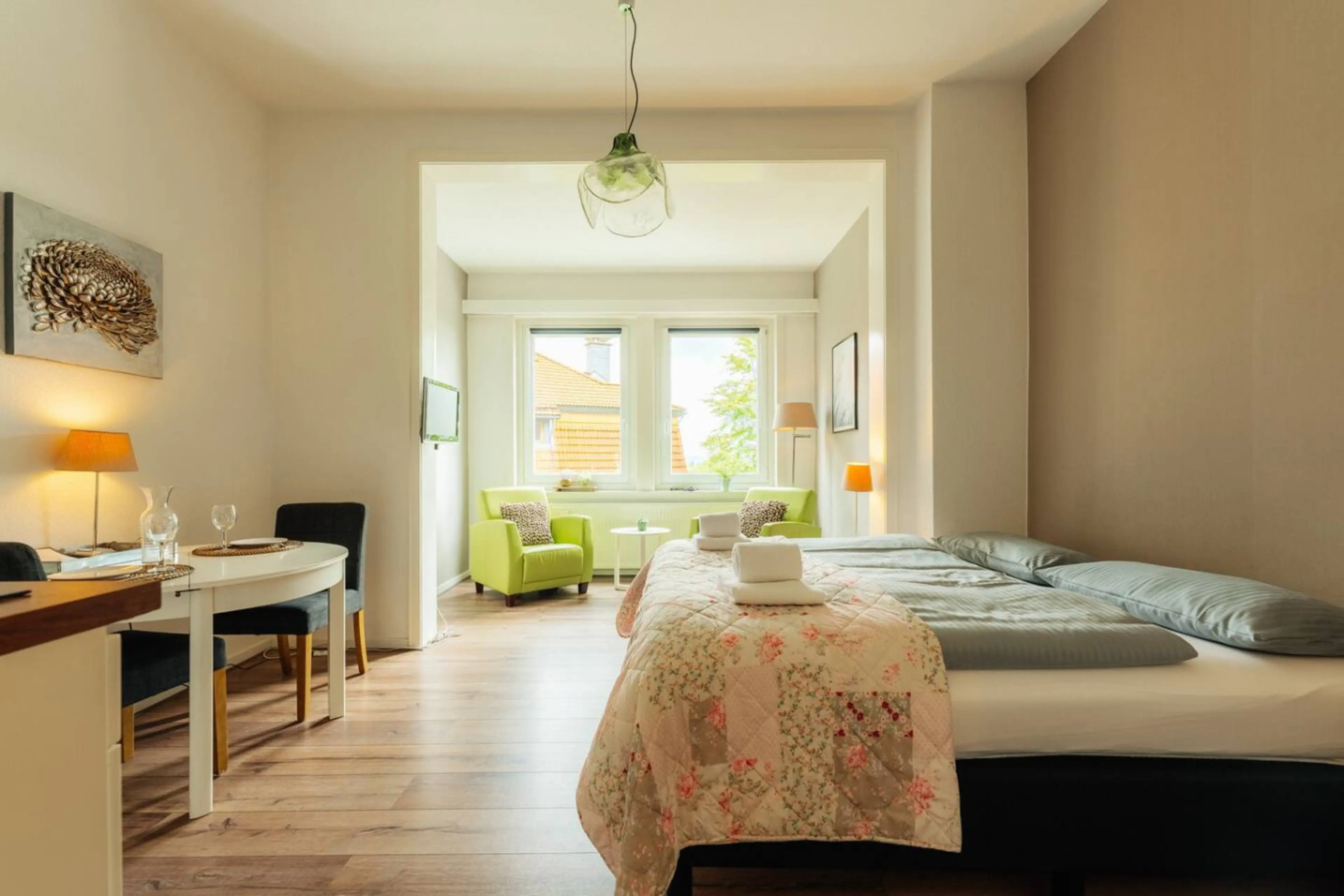 Das Studio ist für 2 Personen ausgestattet und verfügt über zwei Boxspringbetten und eine gemütliche Sitzecke mit zwei Sesseln. Dusche und WC befinden sich in einem separaten Raum. Die Küchenzeile verfügt über eine Kombi-Backofen/Mikrowelle, ein kleines Kochfeld, einen Kühlschrank, eine Kaffeemaschi...
